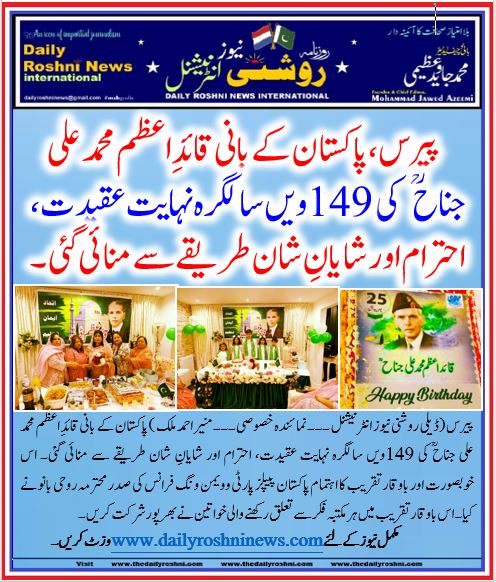 پیرس (ڈیلی روشنی نیوز انٹرنیشنل ۔۔۔نمائندہ خصوصی۔۔۔منیر احمد ملک ) پاکستان کے بانی قائدِ اعظم محمد علی جناحؒ کی 149ویں سالگرہ نہایت عقیدت، احترام اور شایانِ شان طریقے سے منائی گئی۔ اس خوبصورت اور باوقار تقریب کا اہتمام پاکستان پیپلز پارٹی وویمن ونگ فرانس کی صدر محترمہ روحی بانو نے کیا۔