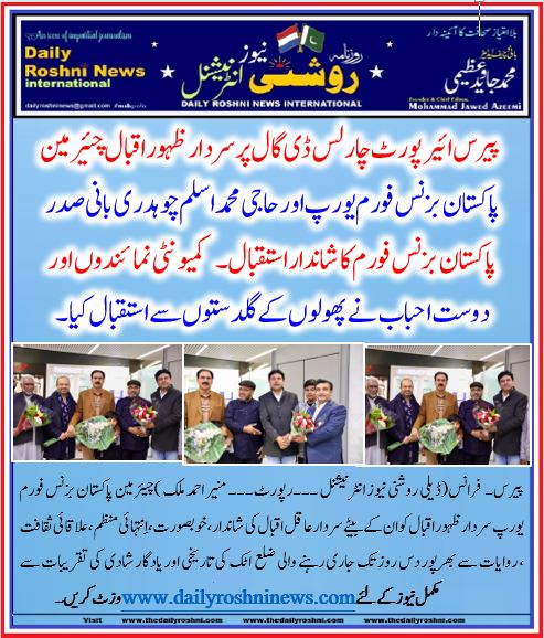 پیرس۔ فرانس(ڈیلی روشنی نیوز انٹرنیشنل ۔۔۔رپورٹ۔۔۔ منیر احمد ملک )چیئرمین پاکستان بزنس فورم یورپ سردار ظہور اقبال کو ان کے بیٹے سردار عاقل اقبال کی شاندار ، خوبصورت، اِنتہائی منظم، علاقائی ثقافت ، روایات سے بھرپور دس روز تک جاری رہنے والی ضلع اٹک کی تاریخی اور یادگار شادی کی تقریبات سے فراغت کے بعد پیرس واپس پہنچنے پر بزنس فورم کے عہدیداران ، کمیونٹی نمائیندوں اور دوست احباب نے پیرس ائرپورٹ پر خوش آمدید کہا ، سردار ظہور اقبال اور حاجی ممحمد اسلم چوہدری کا استقبال پھولوں کے گلدستوں سے کیا گیا ، احباب نے سردار ظہور اقبال کو مبارکباد پیش کی اور کہا کہ آج تک ایسی خوبصورت اور منفرد شادی کبھی نہیں دیکھی ،