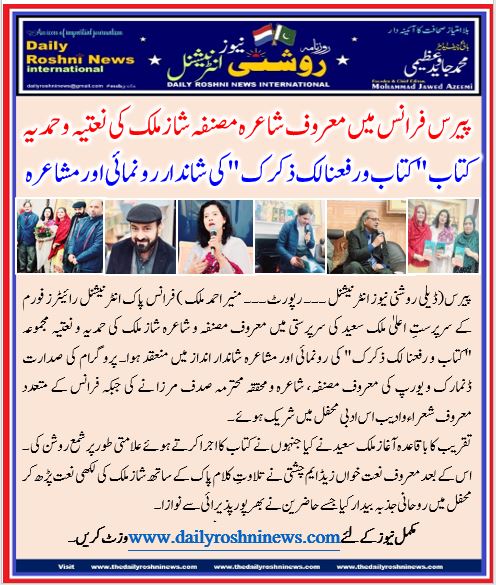 پیرس(ڈیلی روشنی نیوز انٹرنیشنل ۔۔۔ رپورٹ۔۔۔ منیر احمد ملک ) فرانس پاک انٹرنیشنل رائیٹرز فورم کے سرپرستِ اعلیٰ ملک سعید کی سرپرستی میں معروف مصنفہ و شاعرہ شاز ملک کی حمدیہ و نعتیہ مجموعہ “کتاب و رفعنا لک ذکرک” کی رونمائی اور مشاعرہ شاندار انداز میں منعقد ہوا۔ پروگرام کی صدارت ڈنمارک و یورپ کی معروف مصنفہ، شاعرہ و محققہ محترمہ صدف مرزا نے کی جبکہ فرانس کے متعدد معروف شعراء و ادیب اس ادبی محفل میں شریک ہوئے۔
