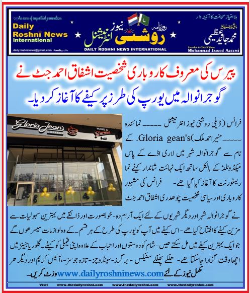 فرانس ( ڈیلی روشنی نیوز انٹرنیشنل ۔۔۔۔۔ نمائندہ ۔۔۔۔۔ منیر احمد ملک )Gloria gean’s. کے نام سے گوجرانوالہ شہر میں لاری اڈے کے پاس میکڈونلڈ کے بالکل ساتھ ایک نہائت شاندار کیفے نما ریسٹورنٹ کا آغاز کیا گیا ھے- فرانس کی مشہور کاروباری اور سیاسی شخصیت چوھدری اشفاق احمد جٹ نے گوجرانوالہ شہر اور دیگر شہریوں کے لئے ایک آرام دہ – خوبصورت اور ذائقے میں بہترین سہولیات سے مزین کیفے کا افتتاح کیا ھے – اس کیفے میں آپ کو یورپ کی طرح کے ہر قسم۔کے وہ لوازمات میسر ھوں گے جو ایک بہترین کیفے میں مل سکتے ھیں- شام کو دوستوں اور احباب کے علاوہ اپنی فیملی کو کیفے۔ گلوریا جینز میں اچھا وقت گزارا جاسکتا ھے- ھلکے پھلکے سنیکس – برگرز-سینڈوچز – تازہ جوسز-،آئیس کریم اور دیگر ھر قسم۔کے وہ لوازمات جو کسی ایک بہترین کیفے میں مل سکتے ھیں وہ یہاں پر میسر ھوں گے – گلوریا جینز کی افتتاحی تقریب میں پیرس سے آئے دوستوں کے علاوہ چوھدری اشفاق احمد جٹ کے قریبی دوستوں اور فیملی کے افراد نے شرکت کی- چوھدری اشفاق احمد جٹ کا کہنا ھے کہ ایک بار کیفے گلوریا جینز کا وزٹ کریں اور وہاں اپنا خوبصورت وقت گذاریں – آپ کو اچھا محسوس ھوگا – رپورٹ منیر احمد ملک پیرس فرانس