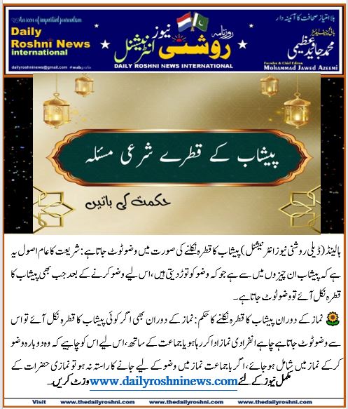 ہالینڈ(ڈیلی روشنی نیوز انٹرنیشنل ) پیشاب کا قطرہ نکلنے کی صورت میں وضو ٹوٹ جاتا ہے: