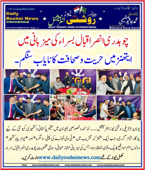 یونان:(ڈیلی روشنی نیوز انٹرنیشنل ۔۔۔نمائندہ خصوصی )یونان میں مقیم پاکستانی و کشمیری کمیونٹی کے لیے یادگار شام گزری، جب ایک مشترکہ تقریب میں *ٹی وی ٹوڈے کی پہلی سالگرہ* اور *یومِ سیاہِ کشمیر* دونوں اہم مواقع کا بیک وقت انعقاد ہوا، جس کی میزبانی ممتاز صحافی و سماجی شخصیت چوہدری انصر اقبال بسراء نے کی۔