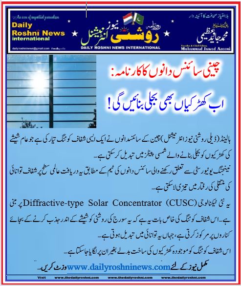 ہالینڈ(ڈیلی روشنی نیوز انٹرنیشنل )چین کے سائنسدانوں نے ایک ایسی شفاف کوٹنگ تیار کی ہے جو عام شیشے کی کھڑکیوں کو بجلی بنانے والے شمسی پینلز میں تبدیل کر سکتی ہے۔