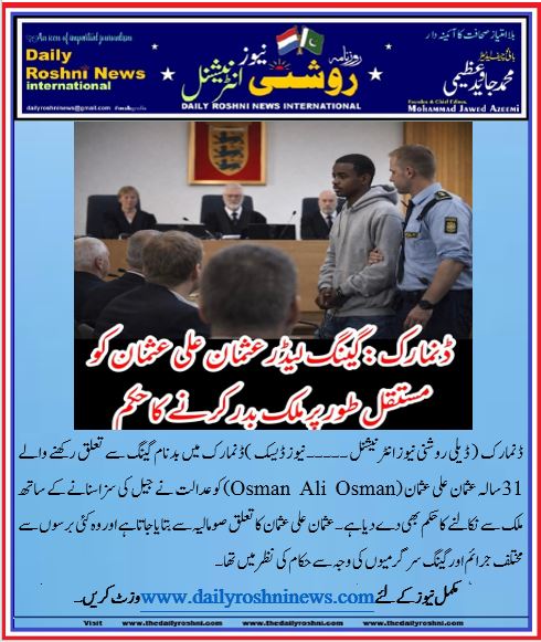 ہالینڈ(ڈیلی روشنی نیوز انٹرنیشنل )ڈنمارک میں بدنام گینگ سے تعلق رکھنے والے 31 سالہ عثمان علی عثمان (Osman Ali Osman) کو عدالت نے جیل کی سزا سنانے کے ساتھ ملک سے نکالنے کا حکم بھی دے دیا ہے۔ عثمان علی عثمان کا تعلق صومالیہ سے بتایا جاتا ہے اور وہ کئی برسوں سے مختلف جرائم اور گینگ سرگرمیوں کی وجہ سے حکام کی نظر میں تھا۔