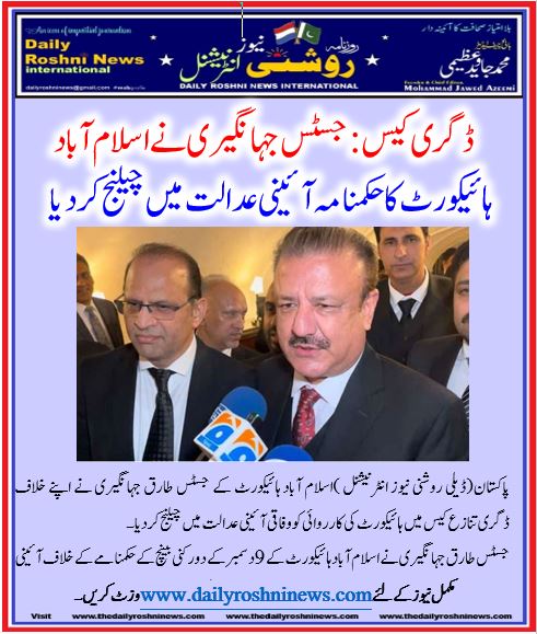 پاکستان(ڈیلی روشنی نیوز انٹرنیشنل )اسلام آباد ہائیکورٹ کے جسٹس طارق جہانگیری نے اپنے خلاف ڈگری تنازع کیس میں ہائیکورٹ کی کارروائی کو  وفاقی آئینی عدالت میں چیلنج کر دیا۔