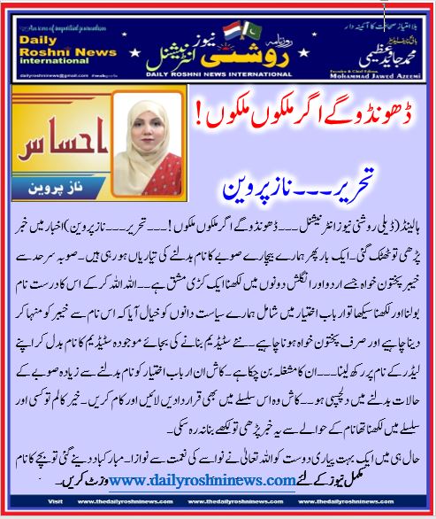 ہالینڈ(ڈیلی روشنی نیوز انٹرنیشنل ۔۔۔ ڈھونڈو گے اگر ملکوں ملکوں !۔۔۔ تحریر۔۔۔ناز پروین )اخبار میں خبر پڑھی تو ٹھٹک گئی۔ایک بار پھر ہمارے بیچارے صوبے کا نام بدلنے کی تیاریاں ہو رہی ہیں ۔صوبہ سرحد سے خیبر پختون خواہ جسے اردو اور انگلش دونوں میں لکھنا ایک کڑی مشق ہے۔۔ اللہ اللہ کر کے اس کا درست نام بولنا اور لکھنا سیکھا تو ارباب اختیار میں شامل ہمارے سیاست دانوں کو خیال آیا کہ اس نام سے خیبر کو منہا کر دینا چاہیے اور صرف پختون خواہ ہونا چاہیے۔نئے سٹیڈیم بنانے کی بجائے موجودہ سٹیڈیم کا نام بدل کر اپنے لیڈر کے نام پر رکھ لینا ۔۔۔ان کا مشغلہ بن چکا ہے ۔کاش ان ارباب اختیار کو نام بدلنے سے زیادہ صوبے کے حالات بدلنے میں دلچسپی ہو ۔۔کاش وہ اس سلسلے میں بھی قراردادیں لائیں اور کام کریں ۔خیر کالم تو کسی اور سلسلے میں لکھنا تھا نام کے حوالے سے یہ خبر پڑھی تو لکھے بنا نہ رہ سکی ۔