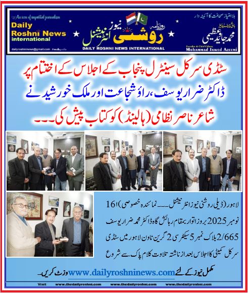 لاہور (ڈیلی روشنی نیوز انٹرنیشنل۔۔۔نمائندہ خصوصی )۱ 16 نومبر 2025 بروز اتوار بمقام رہائش گاہ ڈاکٹر محمد ضرار یوسف 665/2 بلاک نمبر 5 سیکٹر سی 2 گرین ٹاون لاہور میں سٹڈی سرکل کمیٹی کا اجلاس بعد از ناشتہ تلاوت کلام پاک سے شروع ہوا جس میں 27 ویں ائین پاکستان کی ترتیم اور 58 ویں یوم تاسیس کی بابت بحث اور فیصلے کئے گئے ۔