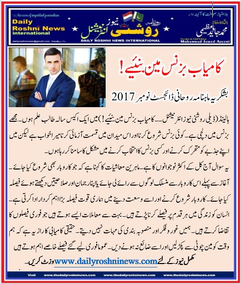 ہالینڈ(ڈیلی روشنی نیوز انٹرنیشنل۔۔ کامیاب بزنس مین بنئیے! )میں ایک اکیس سالہ طالب علم ہوں۔ مجھے بزنس میں دلچی ہے۔ کوئی بزنس شروع کرنا اور اس میدان میں قسمت آزمائی کرنا میرا خواب ہے لیکن میں اپنے جذبے کو متحرک کرنے اور کسی بزنس کا انتخاب کرنے میں مشکل کا سامنا کر رہا ہوں۔