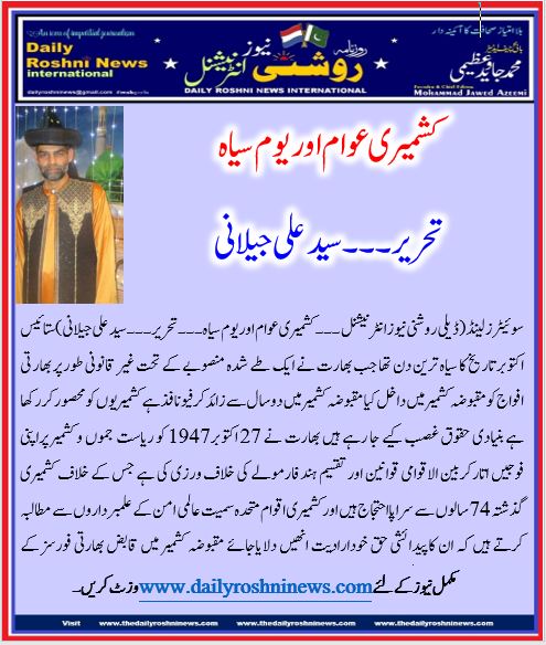 ہالینڈ(ڈیلی روشنی نیوز انٹرنیشنل ۔۔۔ کشمیری عوام اور یوم سیاہ۔۔۔ تحریر۔۔۔سید علی جیلانی )ستائیس اکتوبر تاریخ کا سیاہ ترین دن تھا جب بھارت نے ایک طے شدہ منصوبے کے تحت غیر قانونی طور پر بھار تی افواج کو مقبوضہ کشمیر میں داخل کیا مقبوضہ کشمیر میں دو سال سے زائدکرفیو نافذ ہے کشمیریوں کو محصور کر رکھا ہے بنیادی حقوق غصب کیے جا رہے ہیں بھارت نے 27 اکتوبر1947 کو ریاست جموں و کشمیر پراپنی فوجیں اتارکربین الاقوامی قوانین اور تقسیم ہند فارمولے کی خلاف ورزی کی ہے جس کے خلاف کشمیری گذشتہ 74 سالوں سے سراپااحتجاج ہیں اور کشمیری اقوام متحدہ سمیت عالمی امن کے علمبرداروں سے مطالبہ کرتے ہیں کہ ان کاپیدائشی حق خودارادیت انھیں دلایاجائے مقبوضہ کشمیر میں قابض بھارتی فورسز کے ہاتھوں انسانی حقوق کی سنگین پامالیاں انسانی حقوق کی عالمی تنظیموں کے لیے لمحہ فکریہ ہیں مہذب دنیا مقبوضہ کشمیر میں انسانی حقوق کی سنگین پامالیاں بند کروائے اور بھارت کے قابض اور غاصب حکمرانوں کو ریاستی دہشت گردی کے ذریعے کشمیریوں کے حقوق غصب کرنے سے باز رکھے  ہندوستانی فوج کشمیریوں کے خون سے ہولی کھیل رہی ہے کشمیر کا بچہ بچہ آزادی کی صدا ئیں بلند کر رہا ہے مودی سرکار آئے روز آزادی کی تحریک کو کچلنے کے لیے نئے نئے ہتھکنڈے استعمال کر رہی ہے۔ کبھی مسلمانوں کی اکثریت کو اقلیت میں بدلنے کی کوشش ہو رہی ہے کشمیریوں کو نام نہاد مقابلوں میں شہید کیا جارہا ہے لاکھوں غیر ریاستی باشندوں کو مقبوضہ کشمیر کی شہریت دی جارہی ہے بھارت کے یہ اقدامات خطے میں سیکورٹی سے متعلق شدید خدشات کو جنم دے رہے ہیں کشمیریوں کے حقوق سلب کرنے سے بھارتی مذموم سازش کے خطرناک نتائج برآمد ہوں گے پاکستان کی کوششوں کے باعث آج دْنیا میں بھارتی نام نہاد سیکولیرازم اور جمہوریت بے نقاب ہو چکی ہے، بھارت مذہبی آزادی کے حوالے سے خطرناک ملک بن چکا ہے اورکشمیری اپنے حق خود ارادیت کے حصول کے لیے عزم و استقامت سے کھڑے ہیں بھارت نے پچھلے سال 5 اگست کو بھی انتہائی قابل مذمت اقدامات اٹھاتے ہوئے ایک بار پھر اقوام متحدہ کی سلامتی کونسل کی دھجیاں اڑائیں بھارت اسرائیل طرز پر مقبوضہ کشمیر کی ڈیمو گرافی تبدیل کرنے کی کوشش کر رہا ہے مظلوم کشمیری عوام نے بھارتی سیکورٹی فورسز کے ہر ظلم کے باوجود آزادی آزادی کے نعرے لگا کر اور جابجا پاکستانی پرچم لہرا کر اقوام عالم کے سامنے یہ واضح کردیا ہے کہ وہ اپنی آزادی کا فیصلہ اپنی مرضی سے کرنے کے حق سے پیچھے نہیں ہٹیں گے۔ کشمیر کے معاملے پر حکومت پاکستان نے یہ معاملہ اقوام متحدہ میں کئی بار پہنچایا اور ہر بار اقوام متحدہ کی قرار دادوں میں کشمیر کو متنازعہ علاقہ قرار دے کر اس کے حل کے لئے بھارت پر زور دیا گیا ۔ لیکن کیا وجوہات ہیں کہ اقوام متحدہ بھی اپنی قرار دادوں پر عملدر آمد کروانے میں بے بس ہے  ان حالات میں ضروری ہے کہ عالمی برادری نہتے کشمیری مسلمانوں پر بھارت کے بدترین مظالم کا سلسلہ رکوانے میں کردار ادا کرے، اور مسئلہ کشمیر کو کشمیری عوام کی امنگوں اور اقوام متحدہ کی قراردادوں کے مطابق حل کیا جائے جنوبی ایشیا کا امن مسئلہ کشمیر کے حل سے مشروط ہے کشمیر 4ایٹمی طاقتوں کے درمیان سلگتا ہوا مسئلہ ہے اگر دنیا نے اس پر توجہ نہ دی تو یہ آتش فشاں بن جائے گا جس سے پوری دنیا کا امن خطرے میں پڑھ جائے گاکیونکہ نریندرمودی اس وقت کشمیریوں کو مسلمان ہونے کی سزا دے رہے ہیں تمام اسلامی ممالک ہندوستان کا سیاسی اور معاشی بائیکاٹ کریں اور بلخصوص عالمی برادری کو چاہئے کہ ہندوستان پر دباؤ ڈالے تاکہ کشمیریوں کو اُن کا بنیادی حق خودارادیت دے ہندوستان مذاکرات سے راہ فرار اختیار کر رہا ہے اسے پتہ ہے کہ جب مذاکرات ہونگے تو اُس کے کالے کرتوت دنیا کے سامنے بے نقاب ہونگے عالمی برادری کشمیریوں کے پیدائشی حق حق ارادیت کے لیے اپنا کردار ادا کرے اور اس وقت حکومت پاکستا ن کی کوششوں کی وجہ سے مسئلہ کشمیر پر عالمی حمایت میں مسلسل اضافہ ہو رہا ہے،آج بھارت مذہبی آزادی کے حوالے سے بھی ایک خط