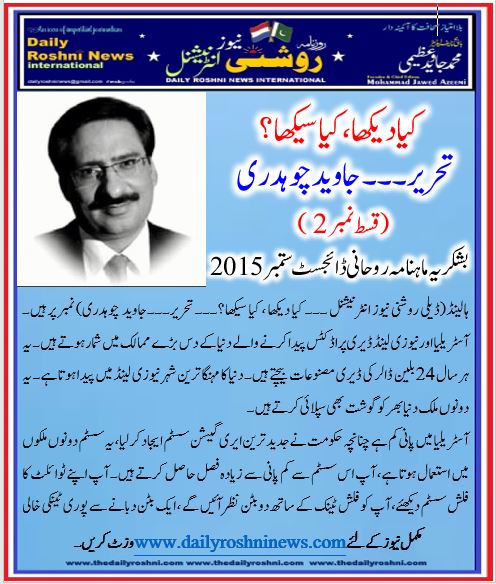 ہالینڈ(ڈیلی روشنی نیوز انٹرنیشنل ۔۔۔ کیا دیکھا ، کیا سیکھا؟۔۔۔ تحریر۔۔۔جاوید چوہدری) نمبر پر ہیں۔ آسٹریلیا اور نیوزی لینڈ ڈیری پراڈکٹس پیدا کرنے والے دنیا کے دس بڑے ممالک میں شمار ہوتے ہیں۔ یہ ہر سال 24 بلین ڈالر کی ڈیری مصنوعات بیچتے ہیں۔ دنیا کا مہنگا ترین شہر نیوزی لینڈ میں پیدا ہو تا ہے۔ یہ دونوں ملک دنیا بھر کو گوشت بھی سپلائی کرتے ہیں۔