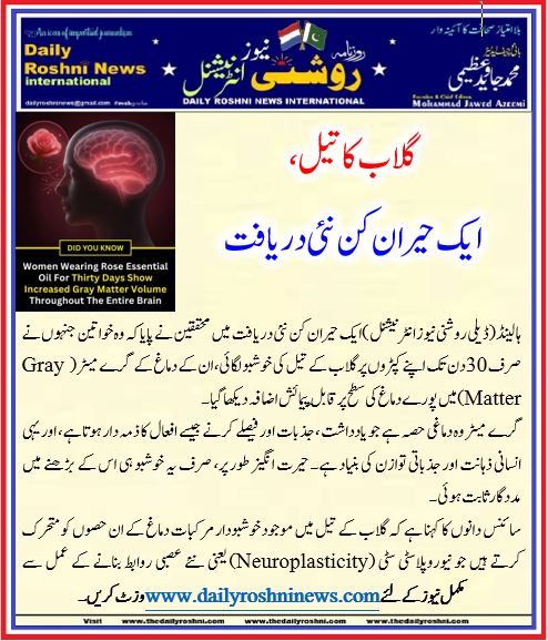 ہالینڈ(ڈیلی روشنی نیوز انٹرنیشنل )ایک حیران کن نئی دریافت میں محققین نے پایا کہ وہ خواتین جنہوں نے صرف 30 دن تک اپنے کپڑوں پر گلاب کے تیل کی خوشبو لگائی، ان کے دماغ کے گرے میٹر (Gray Matter) میں پورے دماغ کی سطح پر قابلِ پیمائش اضافہ دیکھا گیا۔