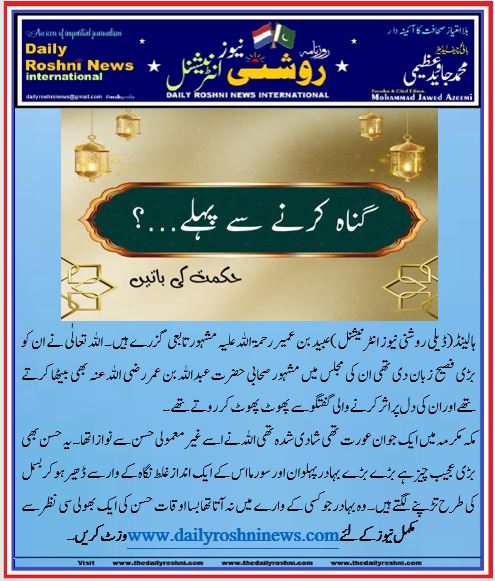 ہالینڈ(ڈیلی روشنی نیوز انٹرنیشنل )عبید بن عمیر رحمۃ اللہ علیہ مشہور تابعی گزرے ہیں۔ اللہ تعالٰی نے ان کو بڑی فصیح زبان دی تھی ان کی مجلس میں مشہور صحابی حضرت عبداللہ بن عمر رضی اللہ عنہ بھی بیٹھا کرتے تھے اور ان کی دل پر اثر کرنے والی گفتگو سے پھوٹ پھوٹ کر روتے تھے۔