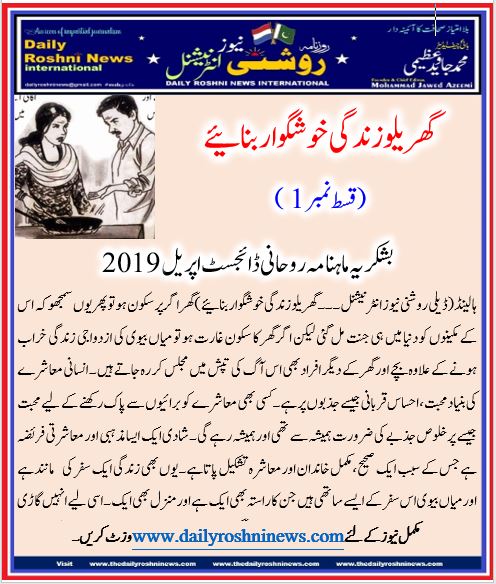 ہالینڈ(ڈیلی روشنی نیوز انٹرنیشنل۔۔۔ گھریلو زندگی خوشگوار بنائیے)گھر اگر پر سکون ہو تو پھر یوں سمجھو کہ اس کے مکینوں کو دنیا میں ہی جنت مل گئی لیکن اگر گھر کا سکون غارت ہو تو میاں بیوی کی ازدواجی زندگی خراب ہونے کے علاوہ بچے اور گھر کے دیگر افراد بھی اس آگ کی تپش میں مجلس کر رہ جاتے ہیں۔ انسانی معاشرے کی بنیاد محبت، احساس قربانی جیسے جذبوں پر ہے۔ کسی بھی معاشرے کو برائیوں سے پاک رکھنے کے لیے محبت جیسے پر خلوص جذبے کی ضرورت ہمیشہ سے تھی اور ہمیشہ رہے گی۔ شادی ایک ایسامذہبی اور معاشرتی فریضہ ہے جس کے سبب ایک صحیح، مکمل خاندان اور معاشرہ تشکیل پاتا ہے۔ یوں بھی زندگی ایک سفر کی
