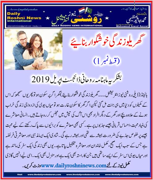 ہالینڈ(ڈیلی روشنی نیوز انٹرنیشنل۔۔۔ گھریلو زندگی خوشگوار بنائیے)گھر اگر پر سکون ہو تو پھر یوں سمجھو کہ اس کے مکینوں کو دنیا میں ہی جنت مل گئی لیکن اگر گھر کا سکون غارت ہو تو میاں بیوی کی ازدواجی زندگی خراب ہونے کے علاوہ بچے اور گھر کے دیگر افراد بھی اس آگ کی تپش میں مجلس کر رہ جاتے ہیں۔ انسانی معاشرے کی بنیاد محبت، احساس قربانی جیسے جذبوں پر ہے۔ کسی بھی معاشرے کو برائیوں سے پاک رکھنے کے لیے محبت جیسے پر خلوص جذبے کی ضرورت ہمیشہ سے تھی اور ہمیشہ رہے گی۔ شادی ایک ایسامذہبی اور معاشرتی فریضہ ہے جس کے سبب ایک صحیح، مکمل خاندان اور معاشرہ تشکیل پاتا ہے۔ یوں بھی زندگی ایک سفر کی