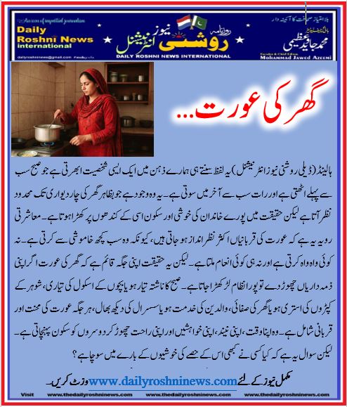 ہالینڈ(ڈیلی روشنی نیوز انٹرنیشنل )یہ لفظ سنتے ہی ہمارے ذہن میں ایک ایسی شخصیت ابھرتی ہے جو صبح سب سے پہلے اٹھتی ہے اور رات سب سے آخر میں سوتی ہے۔ یہ وہ وجود ہے جو بظاہر گھر کی چار دیواری تک محدود نظر آتا ہے لیکن حقیقت میں پورے خاندان کی خوشی اور سکون اسی کے کندھوں پر کھڑا ہوتا ہے۔ معاشرتی رویہ یہ ہے کہ عورت کی قربانیاں اکثر نظر انداز ہو جاتی ہیں، کیونکہ وہ سب کچھ خاموشی سے کرتی ہے۔ نہ کوئی واہ واہ کرتی ہے اور نہ ہی کوئی انعام ملتا ہے۔ لیکن یہ حقیقت اپنی جگہ قائم ہے کہ گھر کی عورت اگر اپنی ذمہ داریاں چھوڑ دے تو پورا نظام لڑکھڑا جاتا ہے۔ صبح کا ناشتہ تیار ہو یا بچوں کے اسکول کی تیاری، شوہر کے کپڑوں کی استری ہو یا گھر کی صفائی، والدین کی خدمت ہو یا سسرال کی دیکھ بھال، ہر جگہ عورت کی محنت اور قربانی شامل ہے۔ وہ اپنا وقت، اپنی نیند، اپنی خواہشیں اور اپنی راحت چھوڑ کر دوسروں کو سکون پہنچاتی ہے۔ لیکن سوال یہ ہے کہ کیا کسی نے کبھی اس کے حصے کی خوشیوں کے بارے میں سوچا ہے؟