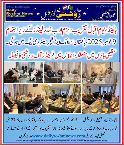 فرینڈز آف روشنی فورم کی ٹیم کے معزز ساتھیوں سے گزشتہ سال  ہونے والی یوم اقبال 2024 کی تقریب کے بارے میں جاوید عظیمی نے اجلاس میں شریک  میاں عاصم محمود ، چوہدری الیاس، جاوید بٹ پیارا ، میاں آفتاب ، میاں عمران ، چوہدری اصغر، راجہ فاروق حیدر ، چوہدری بنارس اور چاند ملک سے  رائے طلب کی تمام ساتھیوں نے فرداً فرداً پروگرام کو سر اہا جبکہ آنے والی تقریب کے لئے قیمتی مشورے بھی دیئے ۔ جاوید عظیمی نے تمام ساتھیوں سے باہمی مشاورت کے بعد متفقہ فیصلے کا اعلان کرتے ہوئے کہا کہ انشا اللہ آپ تمام دوستوں کے تعاون کے ساتھ تیسری سالانہ یوم اقبال، تقریب بروز اتوار 9 نومبر 2025کو برم   ادب نیدرلینڈز کے زیر اہتمام دن دو بجے پاکستان اسلامک اینڈ کلچر سینٹر دی ہیگ میں منعقد کی جائے گی۔پروگرام کو خوب سے خوب تر بنانے اور منظم کرنے کے لئے ٹیم کے ساتھیوں کو مزید ذمہ داریاں دی جائیں گی ۔ جاوید عظیمی نے کہا کہ مذکورہ تقریب  میں  شرکت کے لئے قریبی یورپی ممالک سے شعرائے کرام، اہل علم و دانش حضرات کو خصوصی طور پر مدعوکیا جائے گا۔