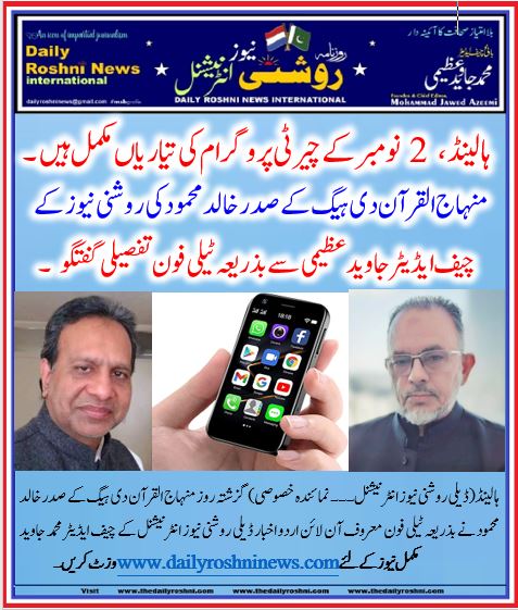 ہالینڈ(ڈیلی روشنی نیوز انٹرنیشنل۔۔۔ نمائنده خصوصی) گزشتہ روز منہاج القرآن دی ہیگ کے صدر خالد محمود نے بذریعہ ٹیلی فون معروف آن لائن اردو اخبار ڈیلی روشنی نیوز انٹرنیشنل کے چیف ایڈیٹر محمد جاوید عظیمی سے بذریعہ ٹیلی فون گفتگو کرتے ہوئے بتایا کہ بروز اتوار دو نومبر 2025 کو دن ایک بجے مقامی ہال میں منعقد ہونے والے چیرٹی پروگرام کو حتمی شکل دے کر تیاریاں مکمل کرلی گئی ہیں۔ انھوں نے مزید کہا کہ متذ کرہ پروگرام میں شرکت کے لئے دعوت عام ہے مگر پرو گرام کومنظم بنانے کے لئے شرکت کےخواہشمند خواتین و حضرات سے التماس ہے کہ دیئے گئے لنک پر اپنے ناموں کا اندراج ضرور کریں ۔
