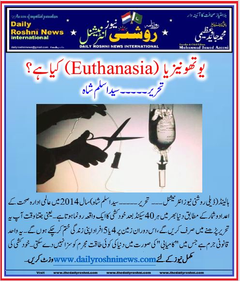 ہالینڈ(ڈیلی روشنی نیوز انٹرنیشنل )سال 2014 میں عالمی ادارہ صحت کے اعدادوشمار کے مطابق دنیا بھر میں ہر 40 سیکنڈ بعد خودکشی کا ایک واقعہ رونما ہوتا ہے۔ یعنی جتنا وقت آپ یہ تحریر پڑھنے میں صرف کریں گے، اس دوران زمین پر 4 یا 5 افراد اپنی زندگی ختم کرچکے ہوں گے۔ یہ واحد قانونی جرم ہے جس میں “کامیابی” کی صورت میں دنیا کی کوئی طاقت مجرم کو سزا نہیں دے سکتی۔ خودکشی کی بہت سی وجوہات، اقسام اور طریقے ہیں۔لیکن یہاں ہم خودکشی کی اس قسم کے بارے میں جاننے کی کوشش کریں گے جسےاخلاقی طور پر درست اور کئی ممالک میں قانونی تصور کیا جاتا ہے۔ اسے “یوتھونیزیا” (Euthanasia) یا پھر “معالج کی مدد سے خودکشی” کا نام دیا جاتا ہے۔