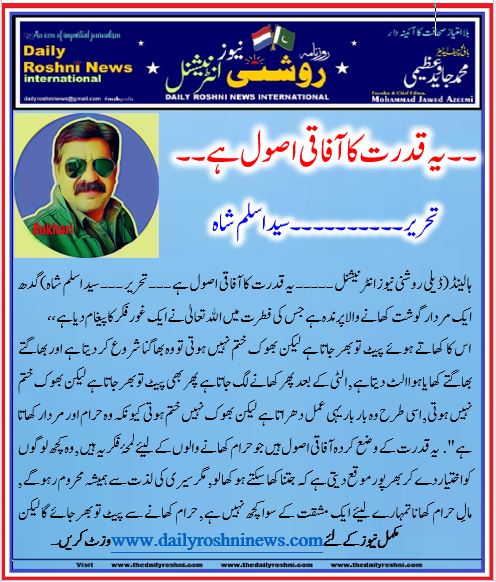 ہالینڈ(ڈیلی روشنی نیوز انٹرنیشنل ۔۔۔۔۔ یہ قدرت کا آفاقی اصول ہے ۔۔۔ تحریر  ۔۔۔  سید اسلم شاہ)گدھ ایک مردار گوشت کھانے والا پرندہ ہے  جس کی فطرت میں الله تعالیٰ نے ایک  غور فکر کا پیغام  دیا ہے،،