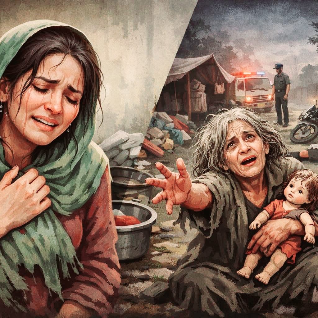 میری اکلوتی بیٹی رو رہی ہے ،دیکھو۔‘‘ وہ گڑیا کو آگے کرتی ہے،روٹی نہیں کھا سکتی،بچے کو دودھ نہیں پلا سکتی۔ خدا کے لیے میری بیٹی کی مدد کرو۔ وہ ساری رات روتی