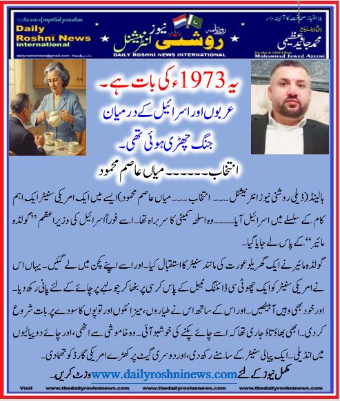 ہالینڈ(ڈیلی روشنی نیوز انٹرنیشنل )ایسے میں ایک امریکی سنیٹر ایک اہم کام کے سلسلے میں اسرائیل آیا۔۔۔۔۔وہ اسلحہ کمیٹی کا سربراہ تھا۔ اسے فوراً اسرائیل کی وزیراعظم ”گولڈہ مائیر“ کے پاس لے جایا گیا۔