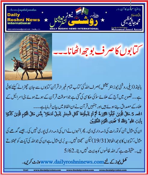 ہالینڈ(ڈیلی روشنی نیوز انٹرنیشنل )صرف اللّٰه کی کتاب تمام غیر از قرآن کتابوں سے جان چھڑانے کیلئے کافی ہے۔۔ تصویر میں آج کے علمائے سؤ کی عکاسی کی گئی ہے جو اسوقت قرآن کے ہوتے ہوئے بنی اسرائیل کے علماء کے مصداق بنے ہوئے ہیں اور جنہیں قرآن نے ان الفاظ میں بیان فرمایا ہے۔۔۔