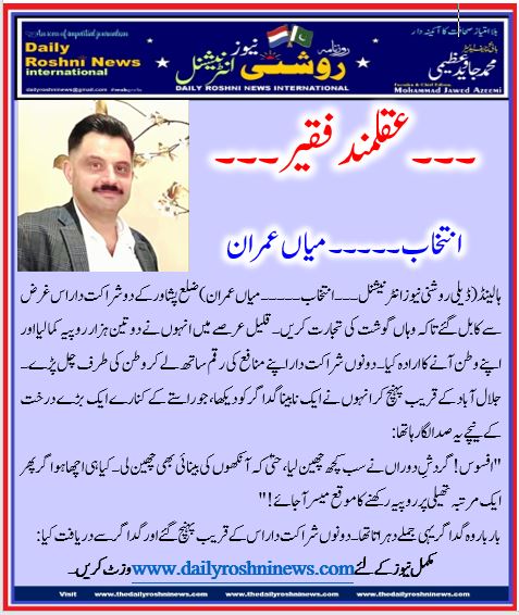 ہالینڈ(ڈیلی روشنی نیوز انٹرنیشنل ۔۔۔ انتخاب ۔۔۔۔۔ میاں عمران)ضلع پشاور کے دو شراکت دار اس غرض سے کابل گئے تاکہ وہاں گوشت کی تجارت کریں۔ قلیل عرصے میں انہوں نے دو تین ہزار روپیہ کما لیا اور اپنے وطن آنے کا ارادہ کیا۔ دونوں شراکت دار اپنے منافع کی رقم ساتھ لے کر وطن کی طرف چل پڑے۔ جلال آباد کے قریب پہنچ کر انہوں نے ایک نابینا گداگر کو دیکھا، جو راستے کے کنارے ایک بڑے درخت کے نیچے یہ صدا لگا رہا تھا: