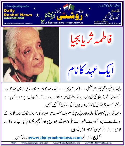 ہالینڈ(ڈیلی روشنی نیوز انٹرنیشنل )ادب کی دنیا میں عہد کا درجہ رکھنے والی فاطمہ ثریا بجیا کی آج برسی ہے‘ آپ طویل عرصے تک اردو ادب کے دامن میں اپنے نایاب فن پارے ٹانکنے کے بعد 85 سال کی عمر میں اس جہانِ فانی سے کوچ کرگئیں تھیں۔