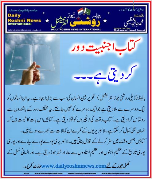 ہالینڈ(ڈیلی روشنی نیوز انٹرنیشنل ) تحریر شاید انسان کی سب سے بڑی ایجاد ہے ۔ یہ ان انسانوں کو ایک دوسرے سے ملا دیتی ہے جو ایک دوسرے کو نہیں جانتے۔ یہ مختلف دور کے باشندوں سے روشناس کرا دیتی ہے۔ کتاب وقت کی زنجیروں کو توڑ دیتی ہے۔ کتابیں اس بات کا ثبوت ہیں کہ انسان بھی کمال کر سکتا ہے۔ لائبریریوں کے کمرے ان کمالات سے بھرے ہوئے ہیں۔