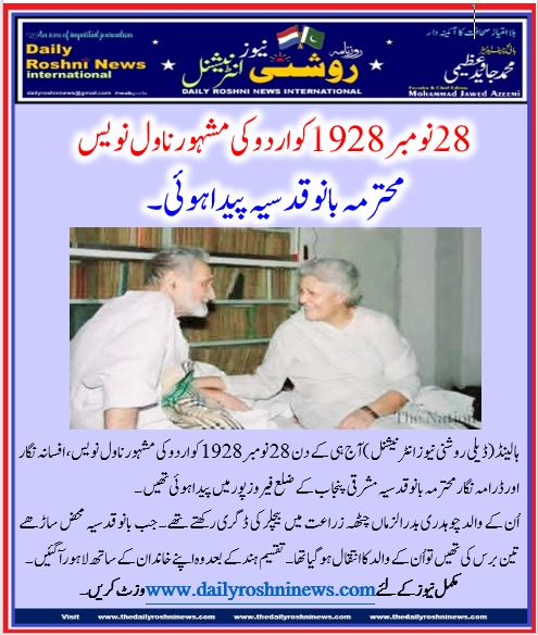 ۔28 نومبر 1928 کو اردو کی مشہور ناول نویس محترمہ بانو قدسیہ پیدا ہوئی۔