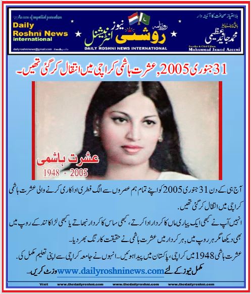 آج ہی کےدن 31 جنوری 2005 کو اپنے تمام ہم عصروں سے الگ فطری اداکاری کرنے والی عشرت ہاشمی کراچی میں انتقال کرگئی تھیں.
