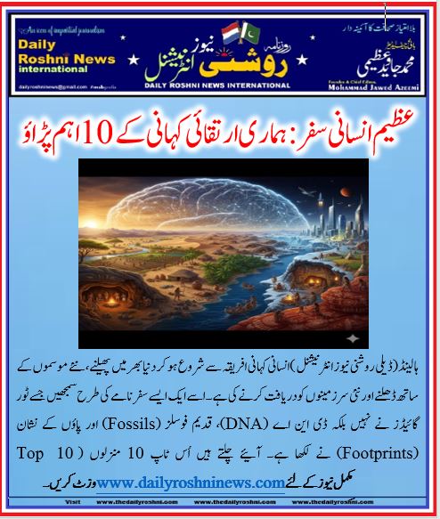 ہالینڈ(ڈیلی روشنی نیوز انٹرنیشنل )انسانی کہانی افریقہ سے شروع ہو کر دنیا بھر میں پھیلنے، نئے موسموں کے ساتھ ڈھلنے اور نئی سرزمینوں کو دریافت کرنے کی ہے۔ اسے ایک ایسے سفرنامے کی طرح سمجھیں جسے ٹور گائیڈز نے نہیں بلکہ ڈی این اے (DNA)، قدیم فوسلز (Fossils) اور پاؤں کے نشان (Footprints) نے لکھا ہے۔ آئیے چلتے ہیں اُس ٹاپ 10 منزلوں (Top 10 Destinations) کی طرف جن پر ہماری ارتقائی یاترا رکی۔