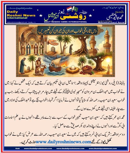 ہالینڈ(ڈیلی روشنی نیوز انٹرنیشنل )پہلا واقعہ:اسماعیل بن ابی حکیم بیان کرتے ہیں کہ ایک شخص نے کہا: میں نے خواب میں عبد الملک بن مروان کو مسجدِ نبوی ﷺ کے قبلے میں چار مرتبہ پیشاب کرتے دیکھا۔ جب یہ خواب سعید بن مسیب رحمہ اللہ کو سنایا گیا تو انہوں نے فرمایا: اگر تمہارا خواب سچ ہے تو عبد الملک کی اولاد میں سے چار خلیفہ اسی قبلے میں کھڑے ہوں گے۔