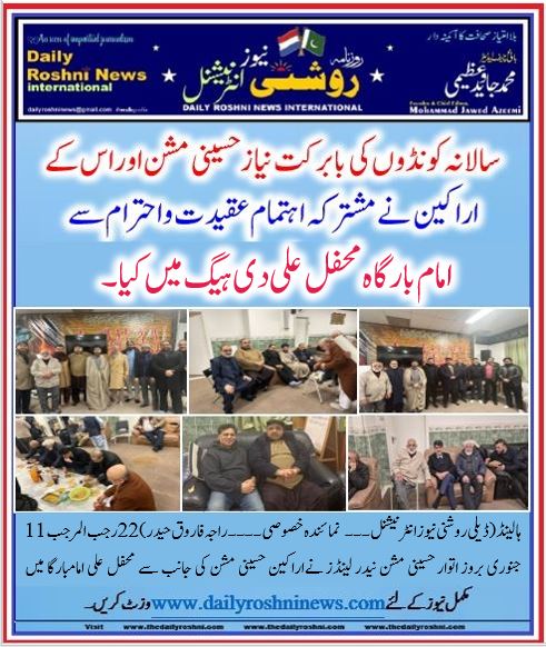 ہالینڈ  ( ڈیلی روشنی نیوز انٹرنیشنل  ۔۔۔۔ نمائندہ خصوصی  ) 22 رجب المرجب 11 جنوری بروز اتوار حسینی مشن نیدر لینڈز نےاراکین حسینی مشن کی جانب سے محفل علی امامبارگا میں مشترکہ نیاز حضرت امام جعفر صادق  علیہ سلام المعروف کنڈوں کی نیازکا اہتمام کیا جس کا سلسلہ سارا دن جاری رہا شام تک نیاز تناول کرنے اور لوگوں کی آمدو رفت کا سلسلہ شروع رہا تقریب میں تمام مکاتب فکر کے لوگوں نے فیملیوں کے ساتھ شرکت کی سفیر اسلامی جمہوریہ ایران  اور دیگر سینکڑوں افراد نے شرکت کی اس موقع پر نماز مغر بین حسینی مشن نیدر لینڈز کے خطیب مولانا سید اسرار حسین کی اقتدا میں ادا کی گئ اور سید اعجاز حسین سیفی نے عالم اسلام کی سر بلندی و سرفرازی کے لئیے دعا کی گئ