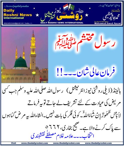 فرمان عالی شان ۔۔۔!! / ہالینڈ کی خبریں, متفرق نگارشات / By Daily Roshni News ہالینڈ(ڈیلی روشنی نیوز انٹرنیشنل) رسول اللہ صلی اللہ علیہ وسلم جب کسی مریض کی عیادت کے لئے تشریف لے جاتے تو یہ فرماتے لاَ بَأْسَ طَهُورٌ إِنْ شَاءَ اللَّهُ۔کوئی فکر کی بات نہیں ۔ انشاءاللہ یہ مرض گناہوں سے پاک کرنے والا ہے۔صحیح بخاری، ٥٦٦٢