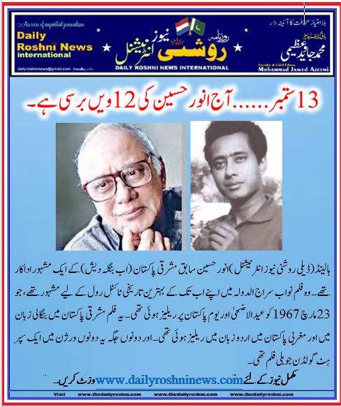 ہالینڈ(ڈیلی روشنی نیوز انٹرنیشنل )انور حسین سابق مشرقی پاکستان (اب بنگلہ دیش) کے ایک مشہور اداکار تھے۔ وہ فلم نواب سراج الدولہ میں اپنے اب تک کے بہترین تاریخی ٹائٹل رول کے لیے مشہور تھے، جو 23 مارچ 1967 کو عیدالاضحیٰ اور یوم پاکستان پر ریلیز ہوئی تھی۔ یہ فلم مشرقی پاکستان میں بنگالی زبان میں اور مغربی پاکستان میں اردو زبان میں ریلیز ہوئی تھی۔ اور دونوں جگہ یہ دونوں ورژن میں ایک سپر ہٹ گولڈن جوبلی فلم تھی۔