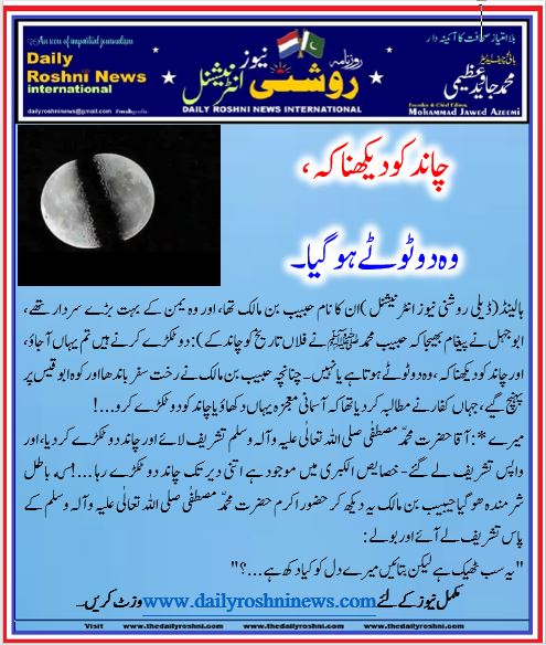 میرے *: آقا حضرت محمّد مصطفٰی صلی اللہ تعالٰی علیہ وآلہ وسلم تشریف لائے اور چاند دو ٹکڑے کر دیا، اور واپس تشریف لے گئے- خصایص الکبری میں موجود ہے اتنی دیر تک چاند دو ٹکڑے رہا …!که باطل شرمنده هو گیا