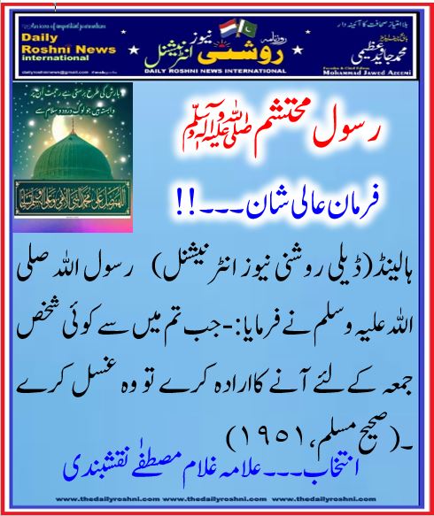 فرمان عالی شان ۔۔۔!! / ہالینڈ کی خبریں / By Daily Roshni News ہالینڈ(ڈیلی روشنی نیوز انٹرنیشنل) رسول اللہ صلی اللہ علیہ وسلم نے فرمایا :-جبا تم میں سے کوئی شخص جمعہ کےلئے آنے کاارادہ کرے تو وہ غسل کرے ۔(صحیح مسلم ،١٩٥١) جمعہ مبارکا