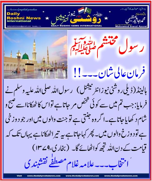 ‏ہالینڈ(ڈیلی روشنی نیوز انٹرنیشنل) رسول اللہ صلی اللہ علیہ وسلم نے فرمایا:جب تم میں سےکوئی شخص مر جاتا ہے تو اس کا ٹھکانا اسے صبح و شام دکھایا جاتا ہے۔اگر وہ جنتی ہے تو جنت والوں میں اور جو دوزخی ہے تو دوزخ والوں میں۔ پھر کہا جاتا ہے یہ تیرا ٹھکانا ہے یہاں تک کہ قیامت کے دن اللہ تجھ کو اٹھائے گا۔ ‏(بخاری، ۱۳۷۹)