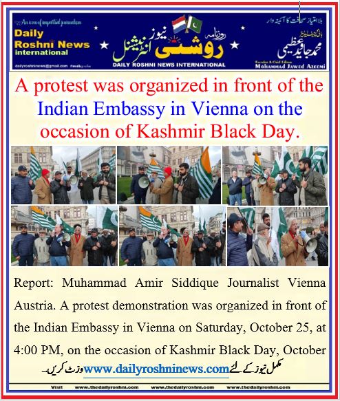 Report: Muhammad Amir Siddique Journalist Vienna Austria. A protest demonstration was organized in front of the Indian Embassy in Vienna on Saturday, October 25, at 4:00 PM, on the occasion of Kashmir Black Day, October 27, under the leadership of Chairman Kashmir Freedom Front Austria Professor Musarat Shaukat Awan. Pakistani and Kashmiri communities gathered in front of the Indian Embassy to express solidarity with their Kashmiri brothers and sisters and to protest against India’s atrocities. On this occasion, the protesters were carrying banners, Kashmiri flags and Pakistan flags, which had prominent messages that the oppression in Kashmir should be ended.