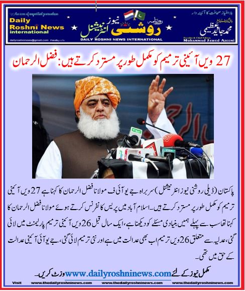 پاکستان (ڈیلی روشنی نیوز انٹرنیشنل )سربراہ جے یو آئی ف مولانا فضل الرحمان کا کہنا ہے 27 ویں آئینی ترمیم کو مکمل طور پر مسترد کرتے ہیں۔