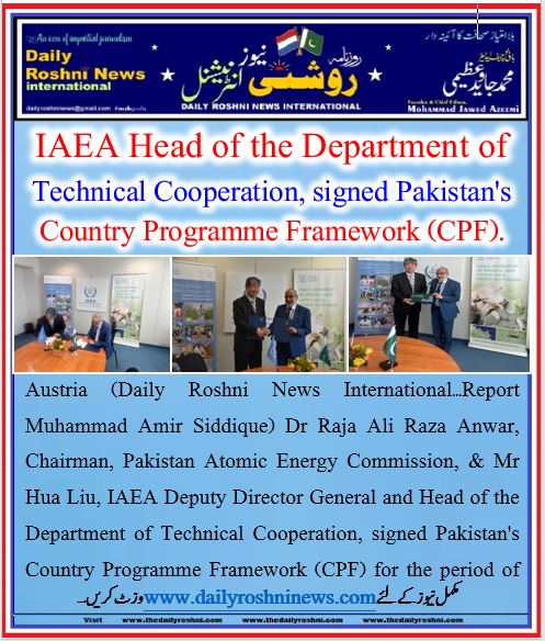 Austria(Daily Roshni News International…Report Muhammad Amir Siddique) Dr Raja Ali Raza Anwar, Chairman, Pakistan Atomic Energy Commission, & Mr Hua Liu, IAEA Deputy Director General and Head of the Department of Technical Cooperation, signed Pakistan’s Country Programme Framework (CPF) for the period of 2026-2031.