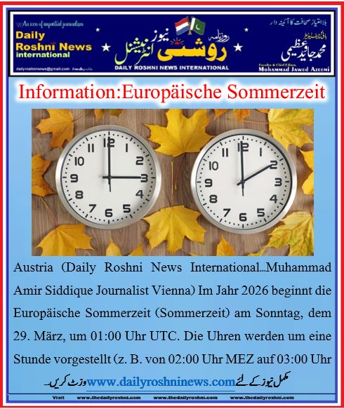 Austria (Daily Roshni News International…Muhammad Amir Siddique Journalist Vienna) Im Jahr 2026 beginnt die Europäische Sommerzeit (Sommerzeit) am Sonntag, dem 29. März, um 01:00 Uhr UTC. Die Uhren werden um eine Stunde vorgestellt (z. B. von 02:00 Uhr MEZ auf 03:00 Uhr MESZ). Diese Umstellung, die für längere und hellere Abende sorgt, gilt für alle EU-Mitgliedstaaten und assoziierten Länder.
