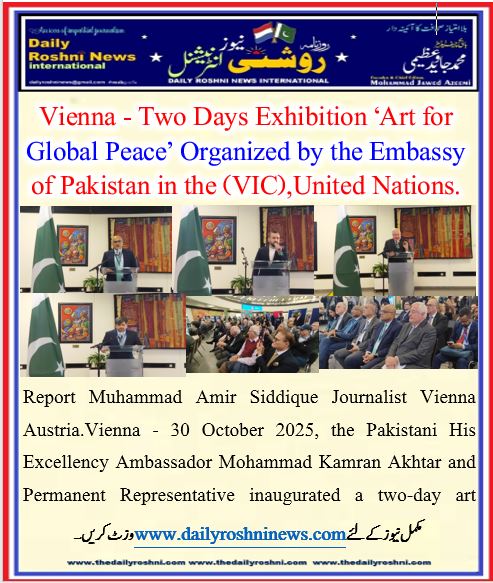 Vienna – 30 October 2025, the Pakistani His Excellency Ambassador Mohammad Kamran Akhtar and Permanent Representative inaugurated a two-day art exhibition under the theme “Art for Global Peace,” organized by the Embassy of Pakistan in Vienna at the Vienna International Centre (VIC),United Nations Office at Vienna.