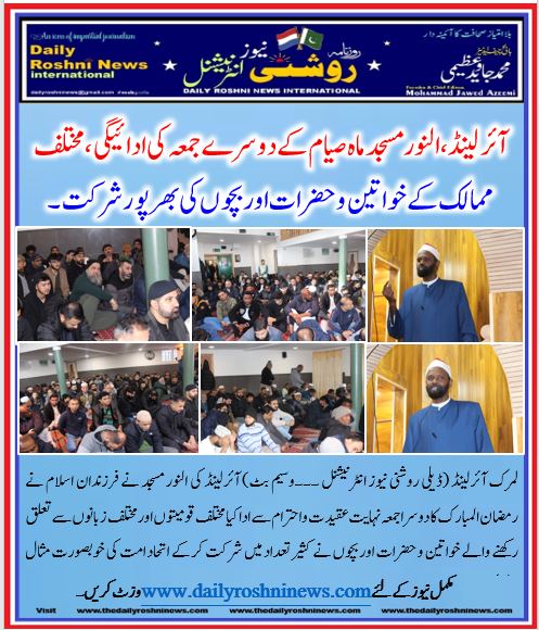 لمرک آئرلینڈ (ڈیلی روشنی نیوز انٹرنیشنل ۔۔۔وسیم بٹ) آئرلینڈ کی النور مسجد نے فرزندان اسلام نے رمضان المبارک کا دوسرا جمعہ نہایت عقیدت و احترام سے ادا کیا مختلف قومیتوں اور مختلف زبانوں سے تعلق رکھنے والے خواتین و حضرات اور بچوں نے کثیر تعداد میں شرکت کر کے اتحاد امت کی خوبصورت مثال پیش کی ۔