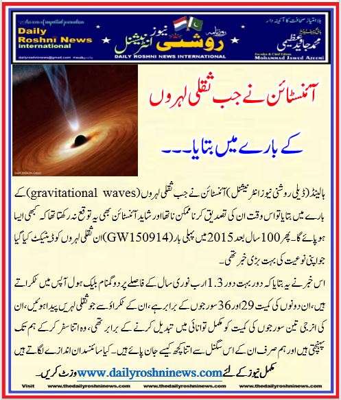 ہالینڈ(ڈیلی روشنی نیوز انٹرنیشنل )آئنسٹائن نے جب ثقلی لہروں (gravitational waves) کے بارے میں بتایا تو اس وقت ان کی تصدیق کرنا ممکن نا تھا اور شاید آئنسٹائن بھی یہ توقع نہ رکھتا تھا کہ کبھی ایسا ہوپائے گا۔ پھر 100 سال بعد 2015 میں پہلی بار (GW150914) ان ثقلی لہروں کو ڈیٹیکٹ کیا گیا جو اپنی نوعیت کی بہت بڑی خبر تھی۔