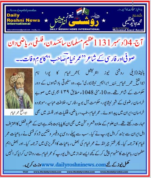 آج – 04دسمبر 1131عظیم مسلمان سائنسدان، فلسفی، ریاضی دان صوفی اور فارسی کے شاعر ”عمر_خیامؔ صاحب“ کا یومِ وفات