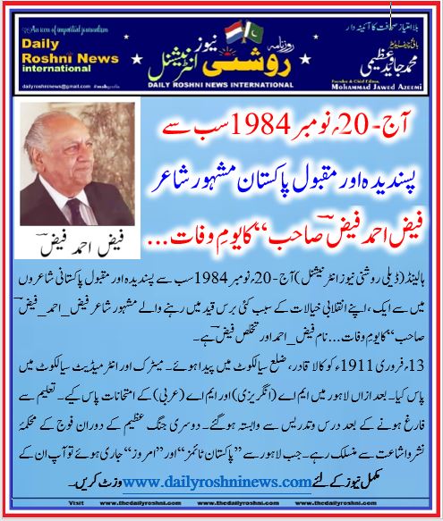 ہالینڈ(ڈیلی روشنی نیوز انٹرنیشنل )آج – 20؍نومبر 1984سب سے پسندیدہ اور مقبول پاکستانی شاعروں میں سے ایک ، اپنے انقلابی خیالات کے سبب کئی برس قید میں رہنے والے مشہور شاعر فیض_احمد_فیضؔ صاحب“ کا یومِ وفات…نام فیض_احمد اور تخلص فیضؔ ہے۔
