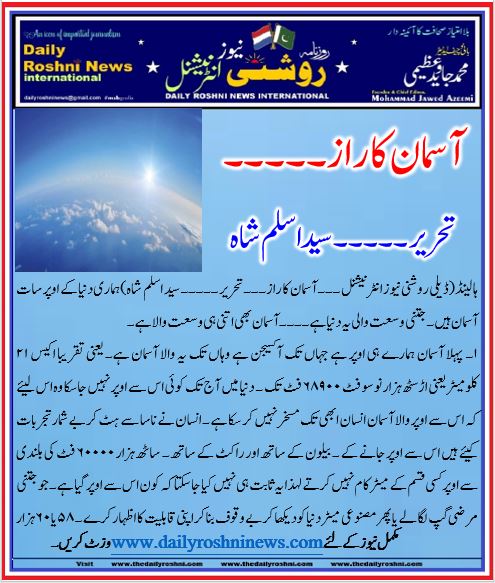 ہالینڈ(ڈیلی روشنی نیوز انٹرنیشنل ۔۔۔ آسمان کا راز ۔۔۔ تحریر  ۔۔۔۔۔  سید  اسلم  شاہ)ہماری دنیا کے اوپر سات آسمان ہیں ۔جتنی وسعت والی یہ دنیا ہے ۔۔۔۔ آسمان بھی اتنی ہی وسعت والا ہے ۔