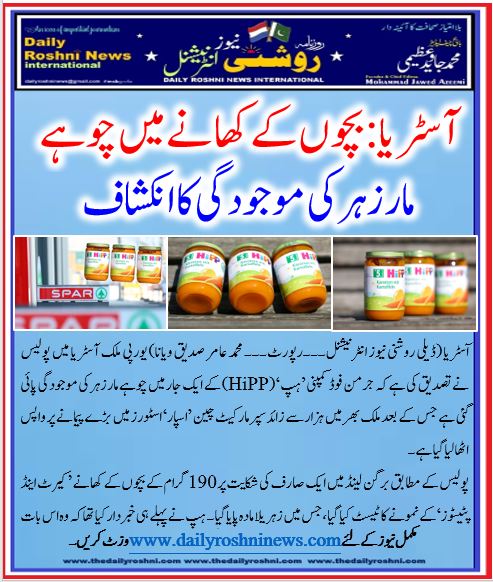 (رپورٹ محمد عامر صدیق ویانا) یورپی ملک آسٹریا میں پولیس نے تصدیق کی ہے کہ جرمن فوڈ کمپنی ’ہپ‘ (HiPP) کے ایک جار میں چوہے مار زہر کی موجودگی پائی گئی ہے جس کے بعد ملک بھر میں ہزار سے زائد سپر مارکیٹ چین ’اسپار‘ اسٹورز میں بڑے پیمانے پر واپس اٹھا لیا گیا ہے۔